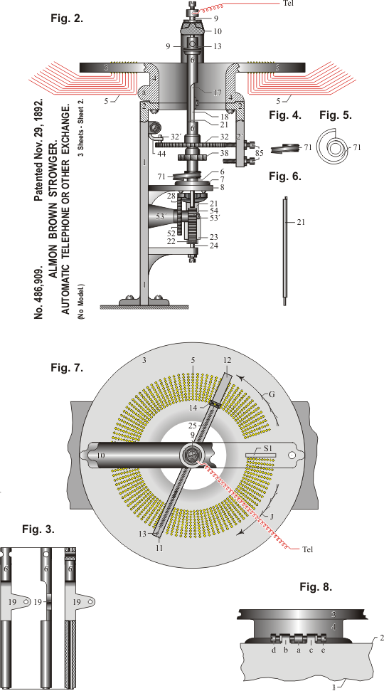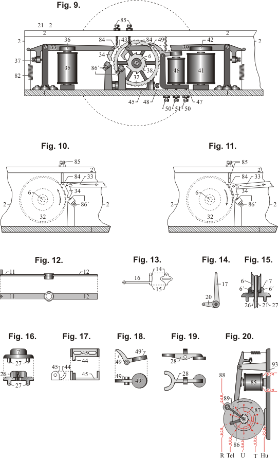 | 4. | Der besondere Drehschalter D S M im Amte zur Verteilung der über die obere Leitung geschickten Stromimpulse. Dieser Schalter kann in vielen Beziehungen der „Seitenschalter” oder Nebenschalter genannt werden, da er wie der Nebenschalter in modernen Schalt werken funktioniert. Der Magnet, welcher ihn betätigt, könnte unter Anlehnung an die modernen Systeme als Prüfmagnet genannt werden, obwohl er in diesem Falle vor Doppelverbindungen nicht schützt. An dem Nebenschalter wäre auszu setzen, dass, wenn er mit dem Drehschalter 92 bei der Teilnehmerstation nicht gleichläuft, das ganze Schaltwerk nicht richtig funktionieren würde. Wenn irgendwie die beiden Drehschalter auch nur um einen Kontakt außer Schritt geraten, dann würde der Teilnehmer in Verlegenheit kommen. Dem Teilnehmer standen keine Mittel zur Verfügung, um eine im Schaltwerk entstandene Falschstellung des Drehschalters berichtigen zu können. | |
